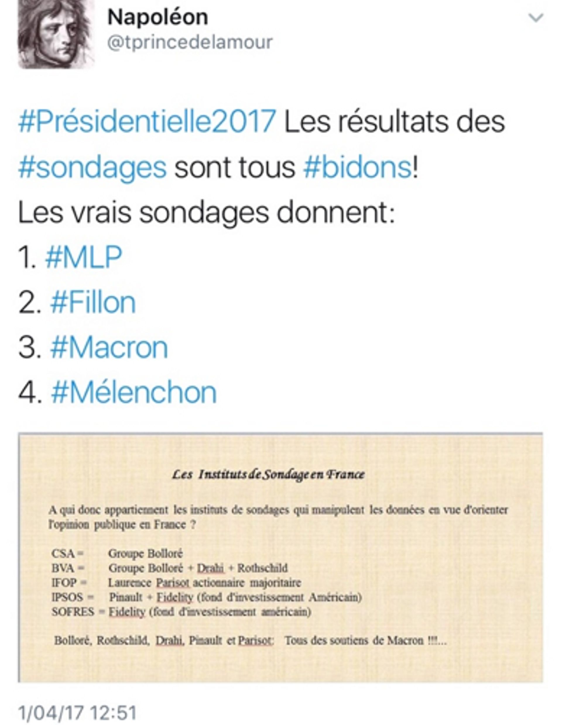 - Les instituts de sondage appartiennent à une oligarchie qui soutient Emmanuel Macron.