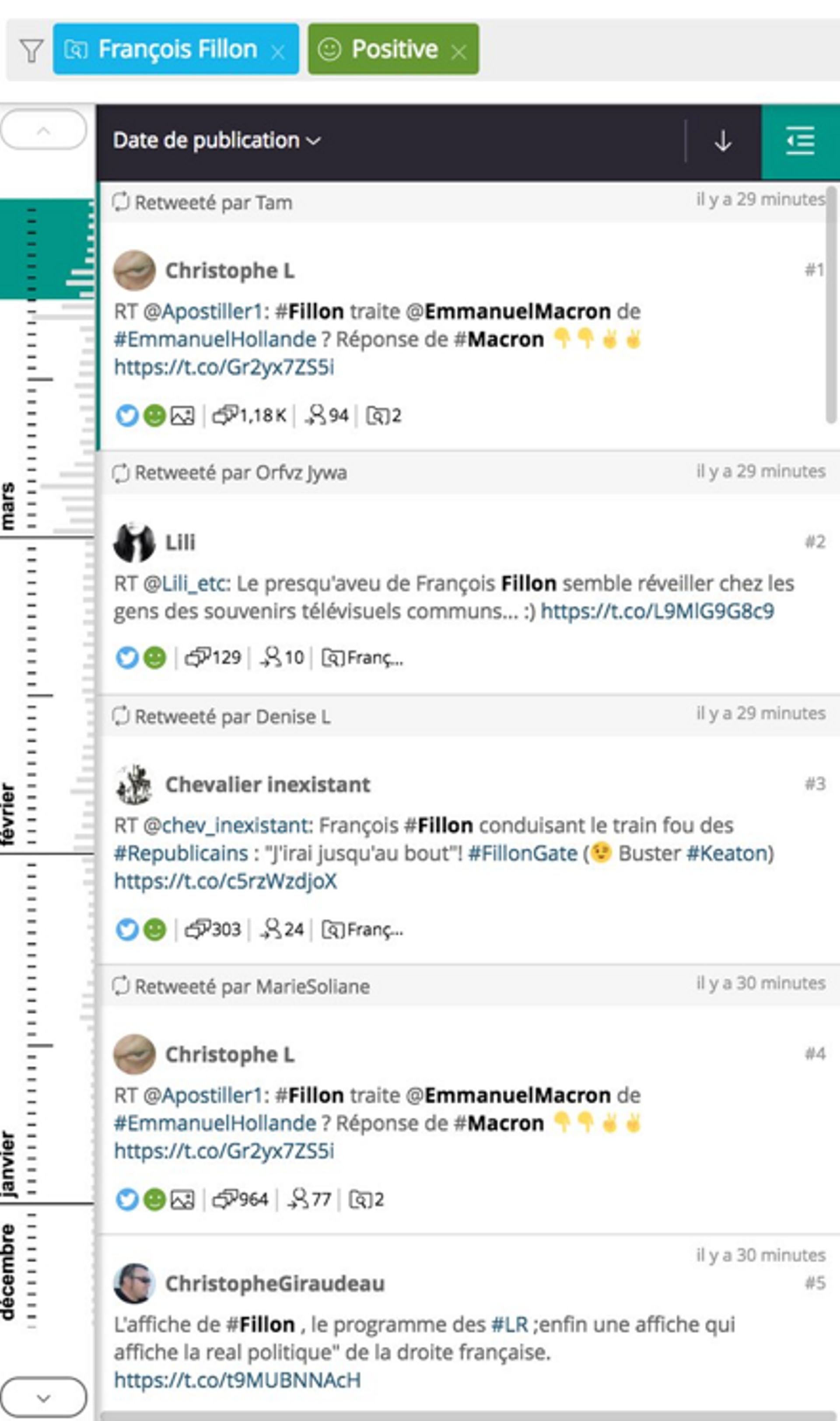 - Les mentions récupérées sont essentiellement issues de Twitter (90 %), réseau social où les techniques de militants influencent grandement les relevés en plus de critères socio-démographiques totalement biaisés. Les dix autres pour cent sont récupérés en grande majorité par le biais des sites Web (95 % provenant de sites d’actualité) et de pages Facebook publiques (90 % de pages militantes ou de pages publiques de médias). La représentativité n’est donc pas présente et l’on comptabilise à de multiples reprises les mêmes occurrences médiatiques dans le calcul.